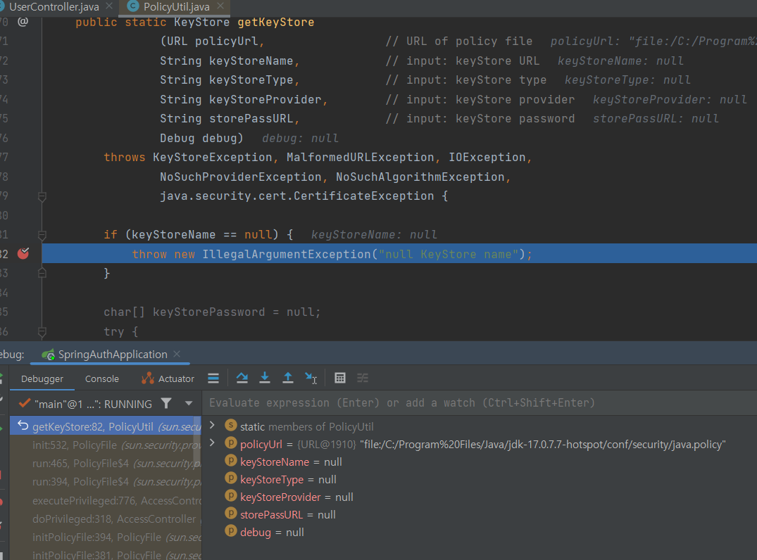 "null keystore name"오류 메시지와 함께 PolicyUtil 클래스의 IllegalArgumentException에서 Debugging 된 경우에 대해서